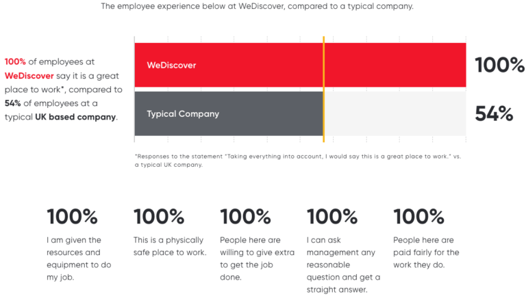 Achieving certification involved the whole UK WeDiscover team taking part in an anonymous, externally run survey that explored areas related to workplace culture, such as job satisfaction, security, happiness, development opportunities and more, with results coming back far above the UK average.